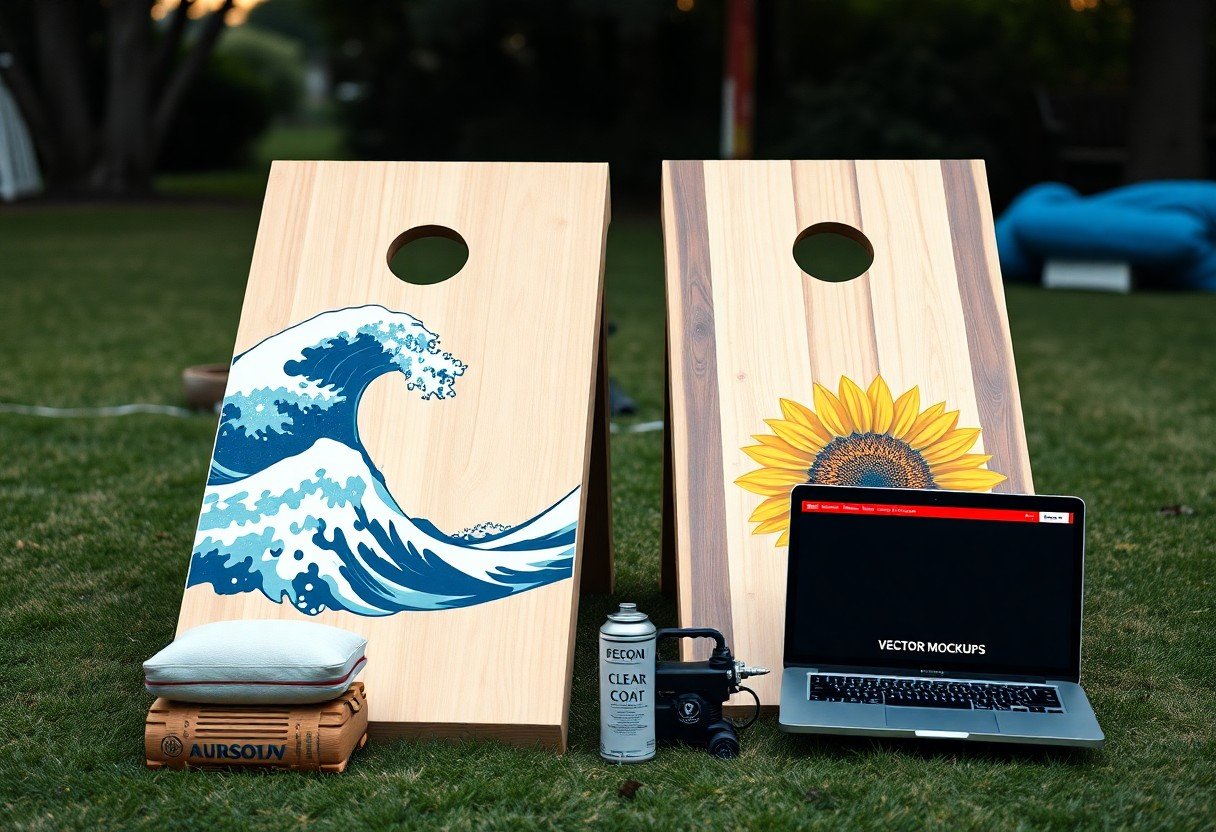 Match your design to use: tournament players favor high-contrast, simple patterns while backyard boards allow detailed art; materials matter too-plywood grades, primer type, and topcoat affect longevity. Consider viewing distance (players stand ~27′ apart) and color contrast for visibility. Knowing how weather exposure, storage, and player skill influence material and graphic choices will guide your final decisions.