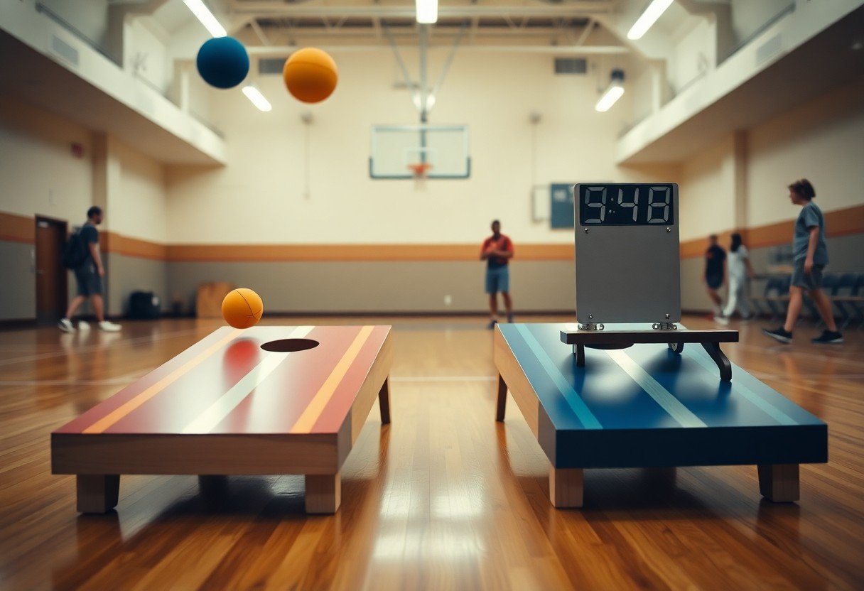 You should also adjust gear and layout: standard boards are 2×4 feet with a 6-inch hole and you use four bags per player, so mark a taped foul line and pad floors to prevent slips. Consider softer or foam bags and place breakables at least 5 feet away from play to avoid accidents. For organized indoor leagues try fixed rules (distance, best-of-3 games) and time limits to keep sessions flowing and fair.