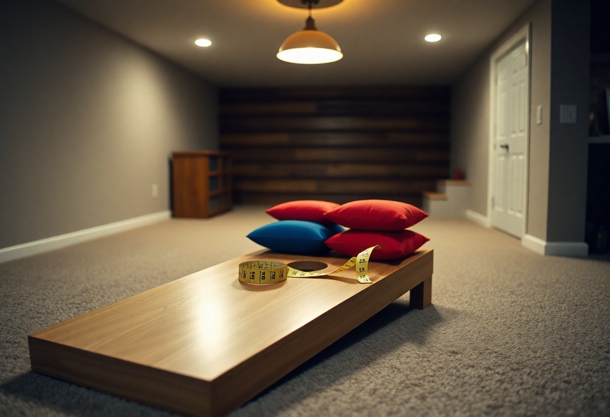 When arranging an indoor cornhole setup, pick a level, low-pile surface and mark the foul line with tape so you and opponents keep consistent throws. Choose reduced-weight bags if ceilings are under 8 feet and allow at least 3 feet clearance each side to avoid furniture damage; keep a 4-foot retrieval zone behind boards and limit throws to underarm in tight rooms. Perceiving how light, traffic flow, and furniture placement affect play will help you fine-tune distance and padding.