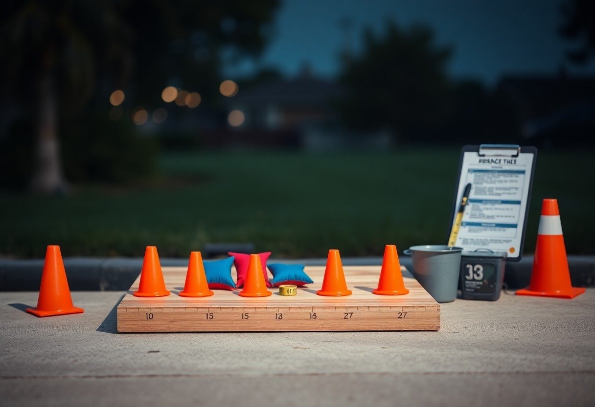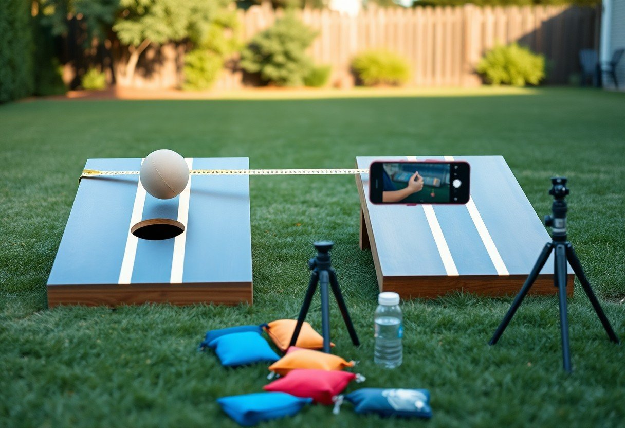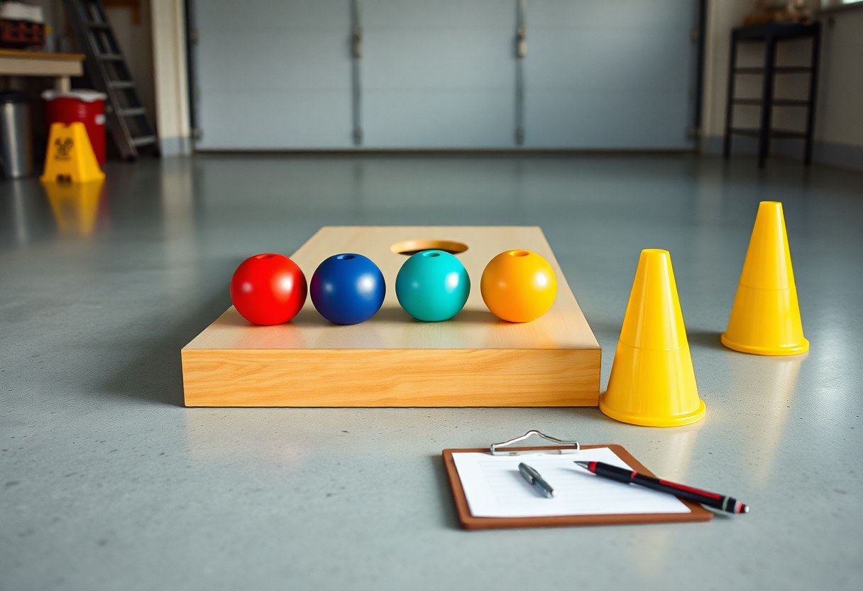 You’ll want a regulation board (48″x24″, 6″ hole), a set of eight bags about 15-16 oz each and 6″x6″, a tape measure, and a clear foul-line marker. Add a phone and tripod for video, cones or painter’s tape for alignment, and a simple bag return or ramp to cut retrieval time. Those items let you simulate tournament conditions and ramp up reps efficiently.
